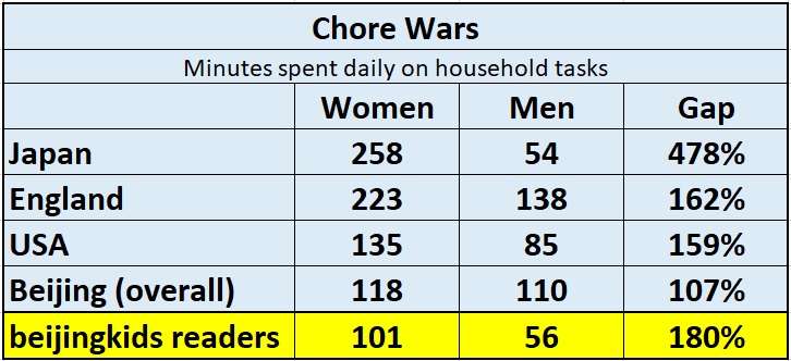 Our reader poll indicates the average woman in the beijingkids readership does almost twice the housework as men – an average of 1 hour and 41 minutes a day, versus 56 minutes for men.