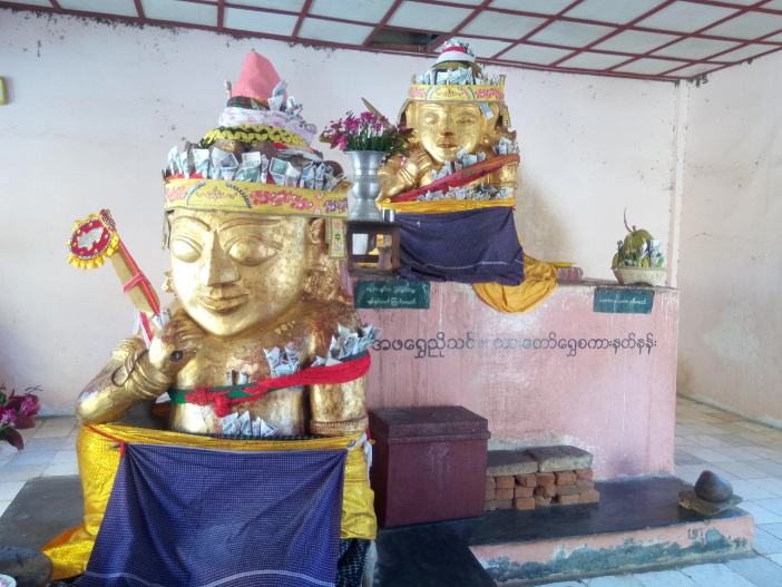 Shwezigon, the last stop on our tour, was the busiest and most active temple, but also perhaps the most disappointing. Apart from the shining gold stupa, stunning against Myanmar’s deep blue sky, it was grubby and crowded. However it was interesting to see shrines to the Nats, the Bamar people’s traditional guardian spirits.