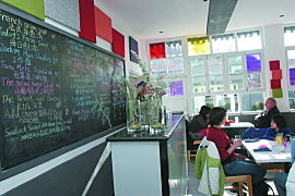 Sunlight enters the renovated classrooms that house the restaurant through yellow, green and violet windows and each table is topped with a bunch of wild flowers. Hungry, antsy kids can be distracted with crayons and blank placemats or sated with a handful of the complimentary – and highly addictive – roasted nuts, which are harvested locally.