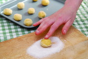 2. Roll the dough between your hands to form nine small balls. Pour some sugar on a flat surface and roll the balls gently over it until coated. Place the balls on an ungreased baking sheet, leaving some space between them. |