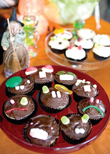 Bake and ice large cupcakes with white or dark brown frosting. Use Tic-Tacs, M&Ms, silver balls, tiny chocolate chips, fruit strips, marshmallows or other candy to create facial features. Cut candy into smaller pieces if necessary. Sprinkle the top of each cake with slivered almonds, green jelly crystals or shredded coconut for a mummy or zombie-style look.