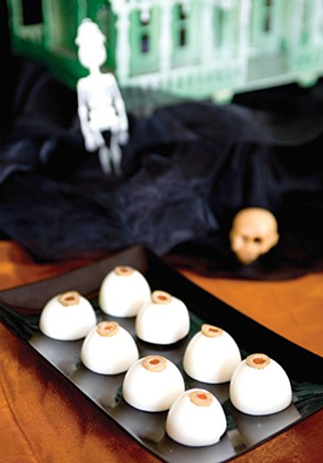 Hard-boil a dozen eggs and cool them in cold water. Peel, dry, cut in half and place on a tray with the flat side down. Cut twelve stuffed olives in half and pat dry. Using a sharp knife, carefully cut small, shallow holes at the top of each egg and gently push in the halved olive, flat side up. For added effect, paint veins on the whites of the "eyes" with a fine brush using red food coloring. Cover and refrigerate until ready to serve.