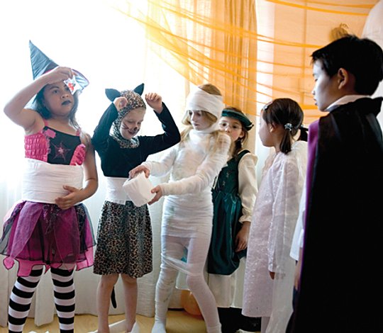 To prepare this game, carefully unravel a roll of toilet paper, then re-wrap it around the cardboard roll, fastening small prizes or wrapped candy every few meters. During the party, have the kids stand in a circle. Have one child wrap the head, arms, legs or torso of the person to his or her left with the toilet paper, stopping when a prize is reached. Then pass the roll on so that the next child in the circle can be "mummified."