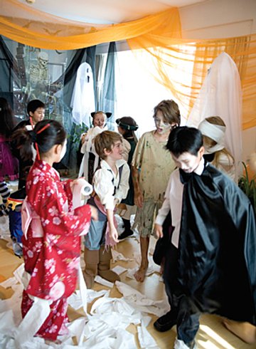 Glue a frightful picture to the outside of a cellophane (or brown paper) bag, then stuff with candy, small toys, stickers, etc. For spooky ideas, hunt around local markets (try Laitai Flower Market or Tot to Teen). Tie the bags with raffia or ribbon.