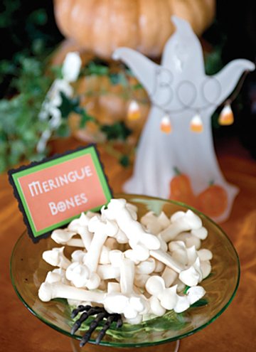 Beat egg whites with cream of tartar and salt. Slowly add in sugar and vanilla, making sure all sugar dissolves. Pour mixture into bag and cut off one of the tips. Squeeze the bag to pipe out bone shapes (lines with two bulbs at each end) onto baking paper. Bake at 95°C (200°F) for one hour. Turn off oven and allow meringue to dry with door ajar for another hour, keeping watch so they don’t brown.
