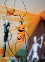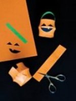 - Paper jack-o-lanterns: Cut orange paper into 15cm x 5 1/2 cm rectangles. Fold in half lengthways and make cuts into the folded edge of the card. Open out and curl around to form a cylinder, then staple or use double-sided tape to secure the ends. Stick a 1cm x 10cm strip of green paper to the outside rim to form a handle, then cut out eye and mouth shapes from black paper and glue onto the face.