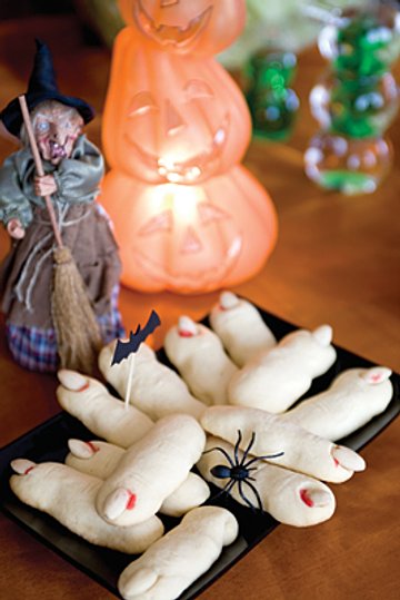 Assemble these gruesome dishes on black, silver, glass or green food dishes. Garnish with plastic spiders or make small bats out of black cardboard, tape them to toothpicks and insert into food.