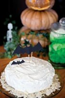 Bake or buy a round cake, preferably with a red jam filling, and smother it with two cans of white frosting, swirled high in ghostly curls. Dot with marshmallow ghosts or any other spooky (edible) treats you can find. Using black cardboard and a wooden skewer, make a large bat cut-out and insert into the top of the cake. Surround cake with slivered almonds or green jelly crystals.