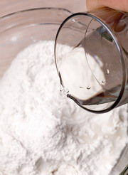 Sift the glutinous rice flour into a bowl. Make a crater in the center and pour in some of the cold water. Slowly mix the water and flour, gradually adding in the rest of the water. Use your fingers to gather the mixture into a sticky dough. You can knead the dough a few times to mix the flour and water thoroughly. The dough should be wet but not too sticky, and should peel easily off the hands.