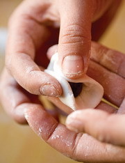 To make tangyuan with filling, break off some of the dough and roll into a ball about two centimeters in diameter. Press flat in your palm to form a thick disk. Gently pinch the edges of the disk so that they are considerably thinner than the center.
