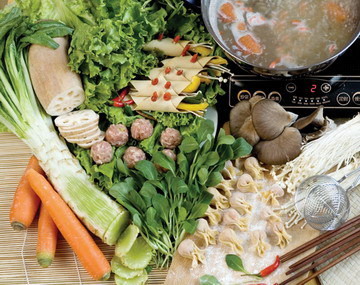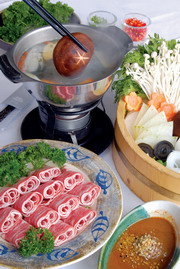 The best thing about hot pot is that anything goes: thick- or thin-cut meat, meatballs, fresh or frozen seafood, tofu, dumplings. Vegetables can be either green and leafy or hearty winter types like pumpkin, lotus root, kale, winter melon and sweet potato. Ingredients cut thin and left to boil for just a few minutes are ready to eat in an instant. Keep in mind that it’s a good idea to separate utensils for eating and cooking, and water should be kept at a steady boil to ensure a sanitary cooking temperature.