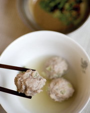 Mix the ground meat with the ginger, cornstarch, sesame oil, egg white, salt and white pepper until it is thoroughly combined and becomes a thick paste. Add the diced wosun and mix well. (Alternately, any kind of vegetable that holds its shape after boiling can be used, such as celery, water chestnuts or carrots. Though optional, they will give the meatball more texture and bite.) To form the meatballs, hold some of the mixture in your fist and squeeze it out between your thumb and forefinger.