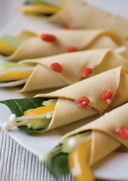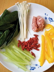 Collect several vegetables that will hold their shape after boiling; choose ones with different colors, such as enoki mushrooms, yellow and green pepper, spinach or kale stems or wosun. Slice the vegetables into thin strips. Take a square sheet of pressed bean curd, spread on some of the meatball mixture from the previous recipe, and place some of the slices of vegetables diagonally across the square sheet. Roll up the sheet and secure with toothpicks. Decorate the points of the toothpicks with vitamin-packed Chinese wolfberries ( gouqi). Soak the wolfberries in hot water for several minutes before using.