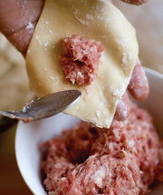 Mix all ingredients together thoroughly until they form a thick paste. Before you wrap the dumplings, you will need to prepare a dish of beaten egg yolk. Place a teaspoon of meat filling in the center of the wrapper (not too much, or else the wrapping will burst). Dab egg yolk along two adjacent edges of the square wrapper, then fold in half and squeeze the edges to seal in the filling. Dab more egg yolk along the new edges and fold into a dumpling shape.
