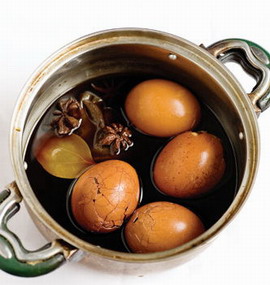 Next, combine black tea leaves, water, salt, light soy sauce and spices in a large pan. Add dashes of dark soy sauce to deepen the color. Bring the liquid to a boil and then gently simmer for 15 minutes.