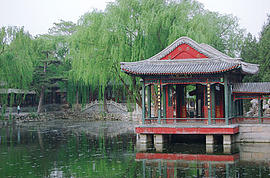 Not far from Longevity Hill is Suzhou Market Street, modeled on the southeastern city of Suzhou. The market was meant to be a place where emperors could pretend to shop like ordinary people; eunuchs and maids of the court would add to the game by playing shopkeepers and other customers. Today, visitors can also wander around the market and make-believe they are in 18th century Suzhou. Over 50 old-fashioned shops – handicraft stands, teahouses, clothing stores and the like – line the banks of the canals. Shop assistants also dress in Qing dynasty costumes to add to the atmosphere.