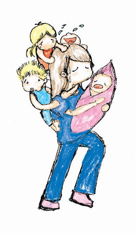 Alas, it’s only 7am. I take a deep breath and manage to remain calm, reminding myself that this is a marathon with much more ground to cover. Next come the diapers to change, the jammies to wash, a baby to nurse, a rash to examine, dishes to clean, lunch and dinner to plan, and a Lego contest to judge. There’s tea to be made for a break that never arrives, then more diapers and more feeding, dog bowls to fill, fights to break up, a spill in the kitchen (Note to self: Buy a refrigerator lock), and all this while holding a fussy newborn who refuses to sleep anywhere but on me.