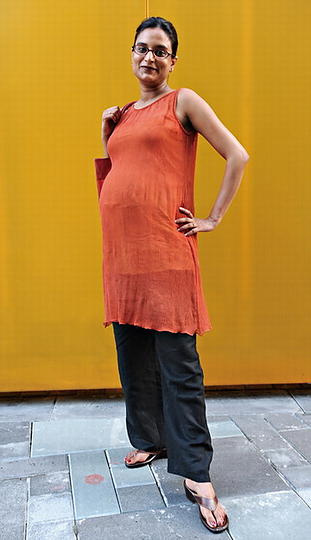 My pants are from Ayou Fashion in Beijing near Sunshine 100. You can tie them in the back. They make peasant-inspired clothes and mix a lot of styles from parts of China, and they tend to look similar to Indian clothes. My shirt is from Delhi, India.