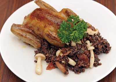 Carrefour offers me a small bird labeled ru’e, or baby goose. I give it a try. Using my toaster oven, I roast the little guy on the turkey principle, applying a lemon juice and salt rubdown for color, and stuffing it with thyme and lemon peel. To counter the goose’s departure from the gluttonous Thanksgiving tradition, I make a rich stuffing of mushrooms and sweet Chinese sausage. I pair the bird with a risotto-like purple rice stuffing, made on the stove. The ru’e emerges from the toaster all golden brown and extremely succulent. Elegant, if that’s the kind of thing preferred, but I feel the skinny little gosling lacks the kind of decadence necessary to carry such a holiday.