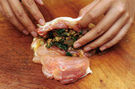 Soak raisins in warm water until plump, or for about 20 mins. To make the stuffing, sauté garlic and onion in oil for about five minutes or until translucent. Add raisins, sunflower seeds, salt, pepper and crushed red pepper; sauté for one minute. Add spinach and cook until wilted. Cool the mixture. Season chicken thighs with salt and pepper. Place a spoonful of stuffing at the edge of each thigh and roll it up. Secure with toothpicks or tie with string. Roll chicken in flour and shake off excess flour. Sauté the chicken rolls in olive oil on high heat until golden on all sides. Deglaze pan with white wine. When the wine has been reduced by half, or after about three minutes, add chicken stock; cover and simmer for 20 minutes. Slice rolls and serve with sauce.