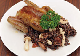 Carrefour offers me a small bird labeled ru’e, or baby goose. I give it a try. Using my toaster oven, I roast the little guy on the turkey principle, applying a lemon juice and salt rubdown for color, and stuffing it with thyme and lemon peel. To counter the goose’s departure from the gluttonous Thanksgiving tradition, I make a rich stuffing of mushrooms and sweet Chinese sausage. I pair the bird with a risotto-like purple rice stuffing, made on the stove. The ru’e emerges from the toaster all golden brown and extremely succulent. Elegant, if that’s the kind of thing preferred, but I feel the skinny little gosling lacks the kind of decadence necessary to carry such a holiday.