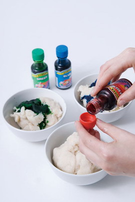 5. Spoon equal portions of dough into bowls and let rest for a few minutes. Add food coloring into the dough and use a spoon to distribute throughout.