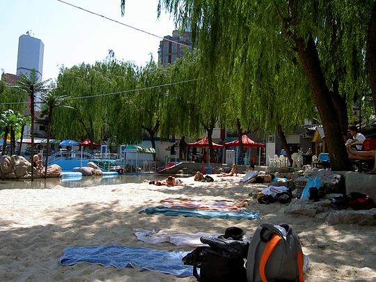 “closest sand & water combo, depending on where you live in the city is within a 5 to 20mn ride or a 2 mn walk from the Hou Jia Lou subway station on line 10… yup, it’s there and I got the pictures to prove it … This little gem hides inside Tuan Jie Hu park, across from Oakwood center off of the 3rd ring road in Beijing. This inconspicuous little gates on the outside hide a marvel of a park complete with lakes, boats, bumper cars, skating ring and more importantly, an artificial wave pool with real sand!”