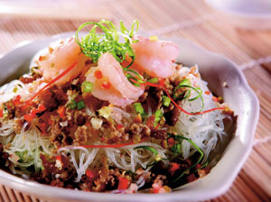 Place noodles into a large heatproof bowl; cover with boiling water. Let stand until just tender; drain. Using kitchen scissors, cut noodles into random lengths. Whisk garlic, sauce, juice and oil in large bowl to combine. Add noodles to bowl with nuts, onions, coriander, chilli and prawns; toss gently to combine. Serve immediately.