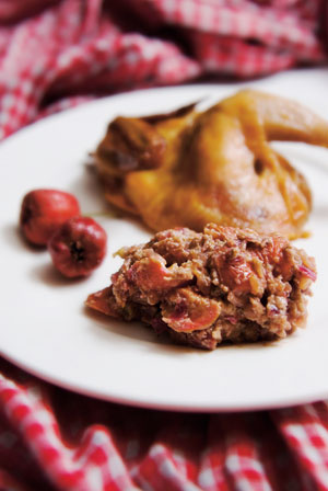 So when I recently thought about revamping holiday dinners, I naturally turned to the ubiquitous haw. You can find these quintessential winter fruits everywhere after mid-October, assembled in giant piles on street corners, being sold by the farmers themselves. The extreme tartness and color lend obvious parallels to cranberries, and for all those North Americans who desperately miss their continent’s addition to the holiday table, I thought a savory walnut, orange and haw relish would work so much better on a turkey than a cylinder of jellied red goo shipped over from its indigenous land. It’s also delicious in sandwiches made with store-bought turkey.