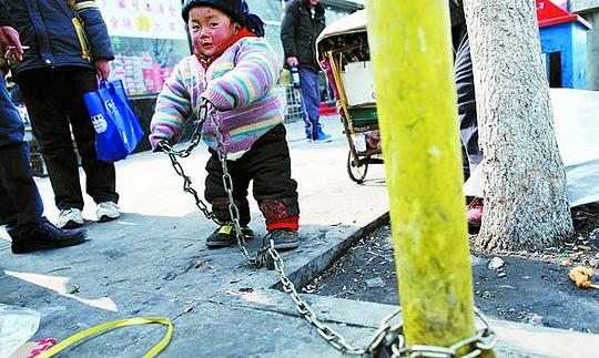 “A two-year-old boy is chained to a lamppost outside a shopping centre in Beijing because his parents fear that he will be abducted.