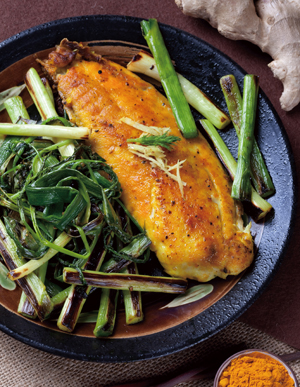 Dust the fish with salt, pepper, turmeric and ginger. Mix and let marinate for 5-10 minutes. In the meantime clean the scallions very well, cutting off the roots and about two inches of green leaves from the top. Combine lemon zest, juice, garlic, fish sauce, olive oil, salt, pepper in a bowl, set the dressing aside. Heat a flat frying pan until very hot. Meanwhile, dust fish with flour until very lightly coated, shaking off any excess flour. Add enough oil to coat the pan. Fry fish until golden on all sides, being careful not to crowd the pan. Remove fish and set aside. Wipe the pan clean. Return to high heat. Add the scallions, drizzle with a little more olive oil, salt and pepper. Grill and turn until the scallions wilt and begin to brown in spots. Add the dill and return the fish back to the pan. Cover and turn the heat down to low. Toss lettuce and cucumber with the dressing prepared earlier. Check to see if the fish is opaque throughout and the dill is wilted. Serve fish with dill and scallions on top, salad on the side, and a very cold, dry white wine.