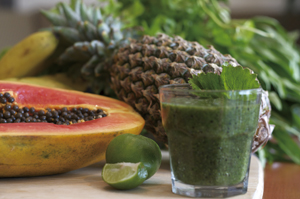 A green smoothie consists of leafy greens and fruits – ingredients that are thoroughly blended with water in a blender. It is important to note that a green smoothie is a blended drink and not juice. Blending rather than juicing breaks down the cellulose structure in the greens, thereby unlocking their valuable nutrients.