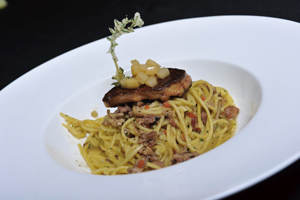 Heat the olive oil in a large, heavy saucepan over medium heat. Add the celery, carrot, tomato and one finely chopped onion. Saute the vegetables until the onion is translucent then season with salt and pepper, to taste. Stir in the chicken broth then add the bay leaves and thyme. Place the sauce to one side. Pre-heat the oven to 230°C. Season the chicken breast with salt, black pepper and olive oil. Clean the skin off one onion, cut it into slices and place it into an oven pan, then place the chicken breast skin down on top of the onion. Place the pan into the oven for 15 minutes then turn the chicken and leave it for another 15 minutes. Once the chicken is done, cut it into long strips and put to the side. Saute the apple, leaving the skin on, with garlic, oil, salt and thyme. Boil the spaghetti for about six-minutes in salt water. Once the pasta is done sauté it with the sauce and a little butter, parmesan cheese and olive oil to taste. Put the spaghetti on a plate and garnish with the apple sauce and chicken pieces.