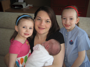 Now I’m torn between returning home or enjoying a nice night away from the children. What if nothing happens and I’m sent home tomorrow anyway? Thankfully, four hours later, contractions begin spontaneously. Eight hours later, aided by gallons of hot water, pressure-point massage and a variety of colorful language, we are proudly nursing our third precious princess. And this time, she was only born one day late. After proving himself a valiant birth support partner for a third time, Baba has announced he’s never ever going through that again.