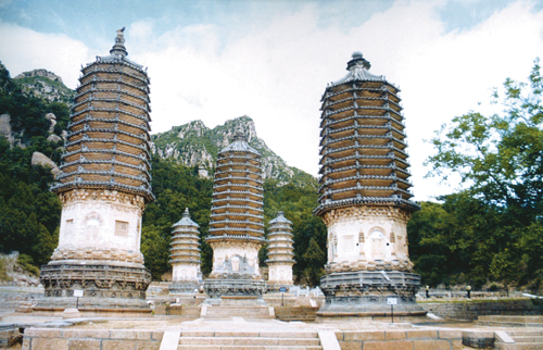 There are many squat dagobas scattered throughout the vale, but the focus of the park is the array of five Jin dynasty towers on the scoured foundations of the Fahua Temple, known at the time of their construction as the Da Yan Sheng Temple – then an eminent place of Buddhist learning. The towers contain the ashes of prominent monastic teachers of the age.