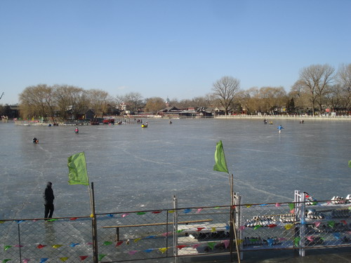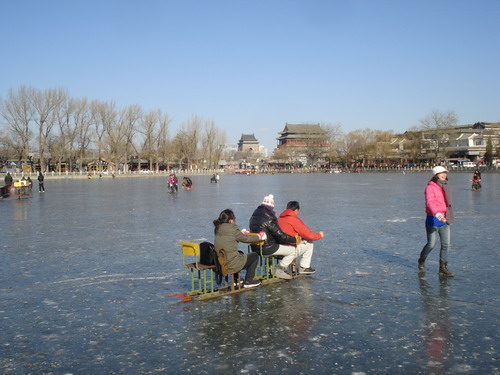 Things have changed a tad at Houhai compared to last year. Everything seems to be a little more organized. Everyone now is now given a small electronic card as opposed to receipts. You still have to pay just to get on the ice (5 RMB, 10 RMB on weekends). Ice skating costs 20 RMB for decent rental skates with a 30 RMB deposit as does the ever popular for couples ice chairing. If you have your own skates then you only need to pay for the park ticket.