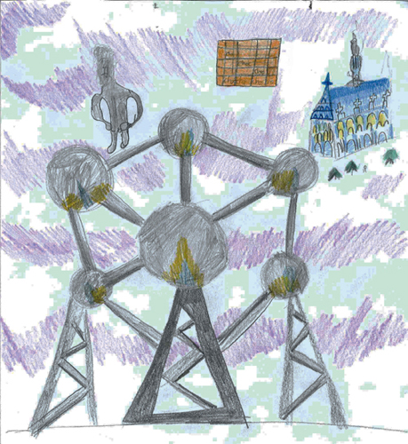 Describe your drawing: My drawing is about my favorite places in Brussels. I love to visit the Atomium, the Mannelkepis statue and the Grand Palace. One of the best things about Belgium is Belgian chocolate, which I have also drawn.
