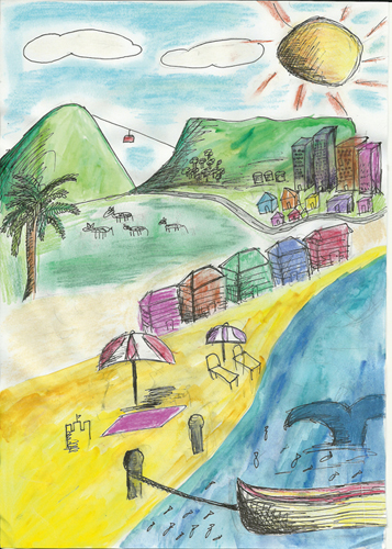 Describe your drawing: I drew a picture of how I remember Cape Town as a child: the famous Table Mountain with the cable car, the buildings, animals such as zebra and springbok, and the winding road that goes around the mountain. Cape Town has a lot of beaches and harbors. There is a big whale tail because I remember seeing quite a few whales there. Everything in the picture is quite colorful, because I remember it to be a colorful, sunny city, full of cultural diversity.