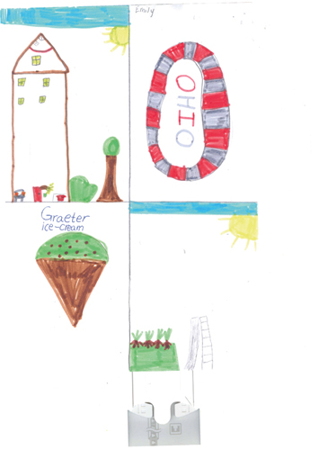 Describe your drawing: In my drawing, there is my house, Graeter’s ice cream place, the Ohio Stadium, and the playground.