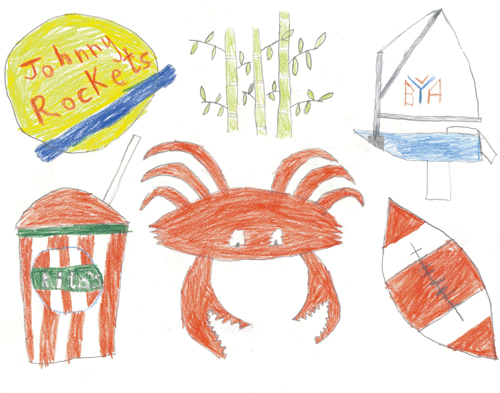Describe your drawing: It has six things that I miss the most about where I live. Johnny Rockets: an all-American diner that serves up the best milkshakes ever; Rita’s Water Ice: one of the best places to get a cool treat on a hot day; three bamboo sticks that represent a tree-lined path down to our neighborhood dock; steamed Maryland crabs, which are a delicacy in the Chesapeake region of the US; a sailboat (Annapolis claims bragging rights as the sailing capital of th US); and a football to represent a favorite American sport.