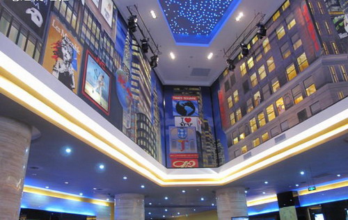 The ceiling of Jinyi’s lobby area is done up in a Broadway theme