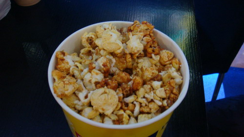 Each order of popcorn contains kernels with varying degrees of caramel coating. Some are completely coated with dark caramel, others lightly covered with caramel, and still others completely devoid of coating (and taste).