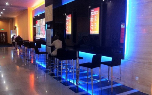 "All form, no function" waiting area. Although designed to be quite chic — with fuzzy high black chairs and tall tables with petite surfaces — the waiting/resting area contains far too few seats for the crowds that collect before the start of a movie. And what few seats they have are bunched into one area, meaning you’ll certainly be sharing personal space with a stranger or two. In addition, the tall tables tend to be unstable — be careful or your bucket of golden popcorn will slide off onto the ground before it reaches your mouth.