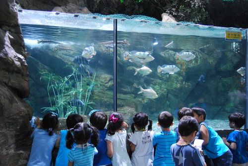 The aquarium greets guests with a tropical Amazonian jungle setting complete with tanks full of colorful freshwater and saltwater fish. Whites Whales are displayed in big tanks, where excited 5-year-olds are likely to gather on field trips to stare at the gigantic bodies of these sea creatures. A food court and glittery gift stands also line the inside of the aquarium.