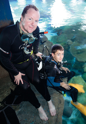 Schwankert and one of his students do a safety check before taking a dive into the main tank at the Blue Zoo