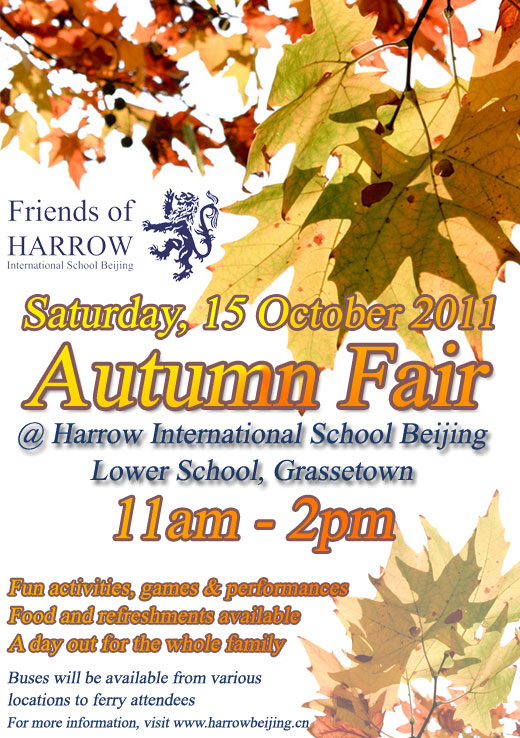 Buses to the Autumn Fair will be leaving at 10am from several locations in Beijing, including the Harrow Upper School Campus in Anzhen Xili, Sanlitun, and Wangjing.