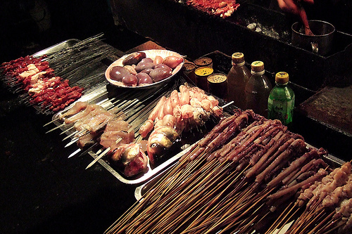 (…) Sanyuanli food market’s meat stalls filled with piles of meat — uncovered, open to the non-chilled air, flies flittering between hanging carcasses. And this is supposed to be where top restaurants buy their food?