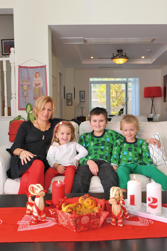 We don’t over-decorate, but we do have red table runners, elves and gnomes in the windows, a lot of candles, and a lot of Christmas music. Food that is important to us includes Swedish meatballs, Jansson’s Temptation (a gratin with shredded potatoes, cream and anchovies), home-baked saffron rolls, and gingerbread cookies. We drink must, a carbonated soda the same color as Coke, but it has a very special taste. Since we only drink it for Christmas, it tastes [like]Christmas to Swedish kids. Another special drink that we start drinking in early December is glogg – a sweet, hot wine with Christmas spices, raisins and almonds. Where do we get everything? Ikea is a goldmine! You can find everything there; it’s just great.