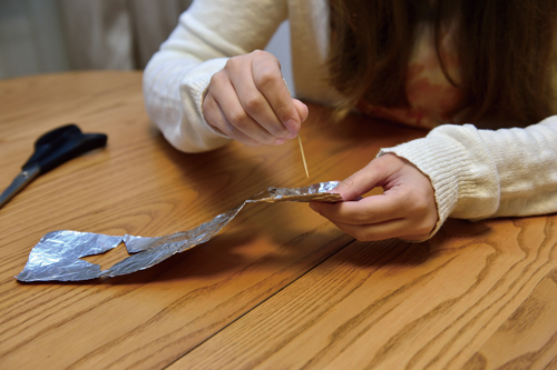 Unfold the foil and use a toothpick to put holes through the foil, making patterned designs. Make as many holes as possible to allow the light to shine through; just be cautious about ripping the tinfoil.
