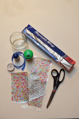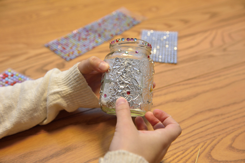 Apply glue on the dull side of the foil, then paste it to the jar.
